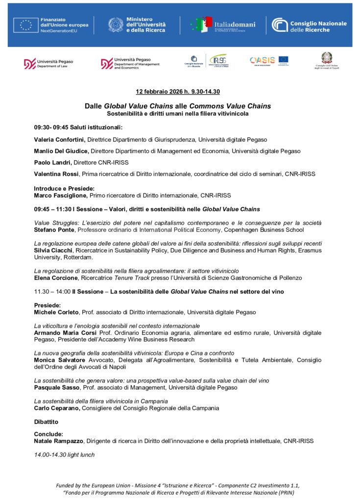 12 febbraio 9:30-14.30 – Dalle Global Value Chains alle Commons Value Chains. Sostenibilità e diritto umani nella filiera vitivinicola